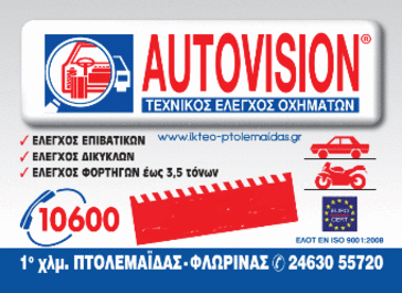 Στο πλαίσιο αυτό, το Ι.ΚΤΕΟ Πτολεμαϊδας της AUTOVISION που βρίσκεται στο 1οχιλιόμετρο της Εθνικής Οδού Πτολεμαίδας-Φλώρινας, δηλώνει για μία ακόμη φορά ότι είναι στην διάθεση κάθε τοπικής αρχής, φορέα και ομάδας πολιτών, για συμμετοχή σε τέτοιες δραστηριότητες και πρωτοβουλίες, σχετικά με την οδική συμπεριφορά και την πρόληψη για την μείωση των τροχαίων ατυχημάτων.